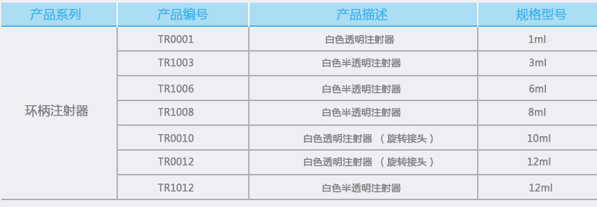 耐压,密封性能好,确保临床使用效果及安全; 人性化环柄设计,单手操作轻松简便,提升临床工作效率; 多种规格满足临床应用需要; 规格:1ml / 3ml / 6ml / 8ml / 10ml / 12ml / 20ml / 30ml / 60ml